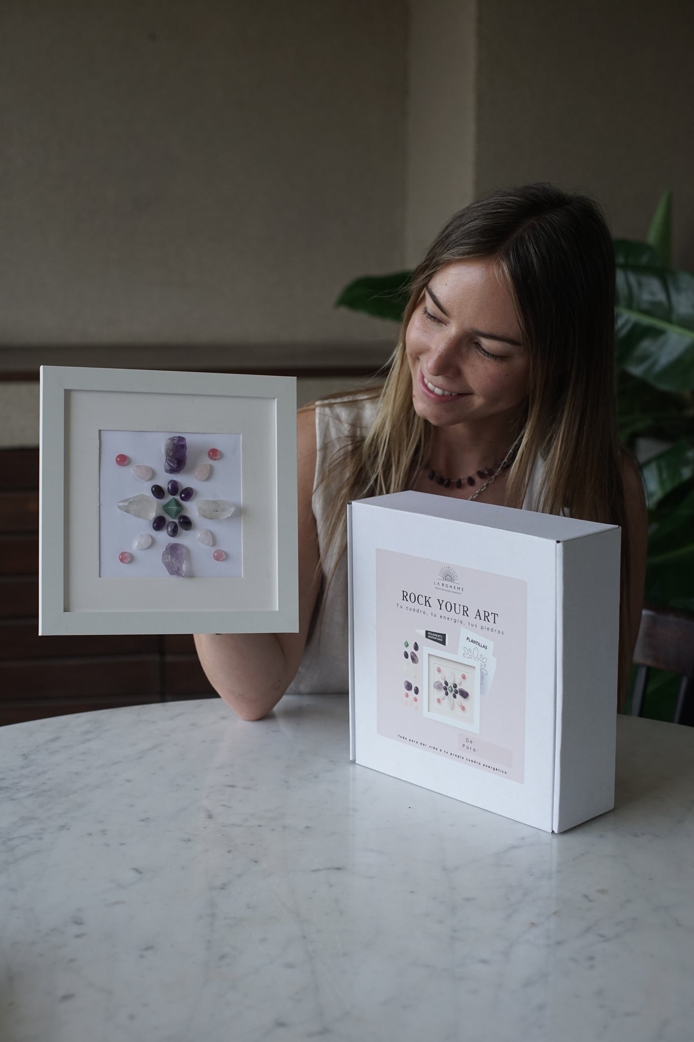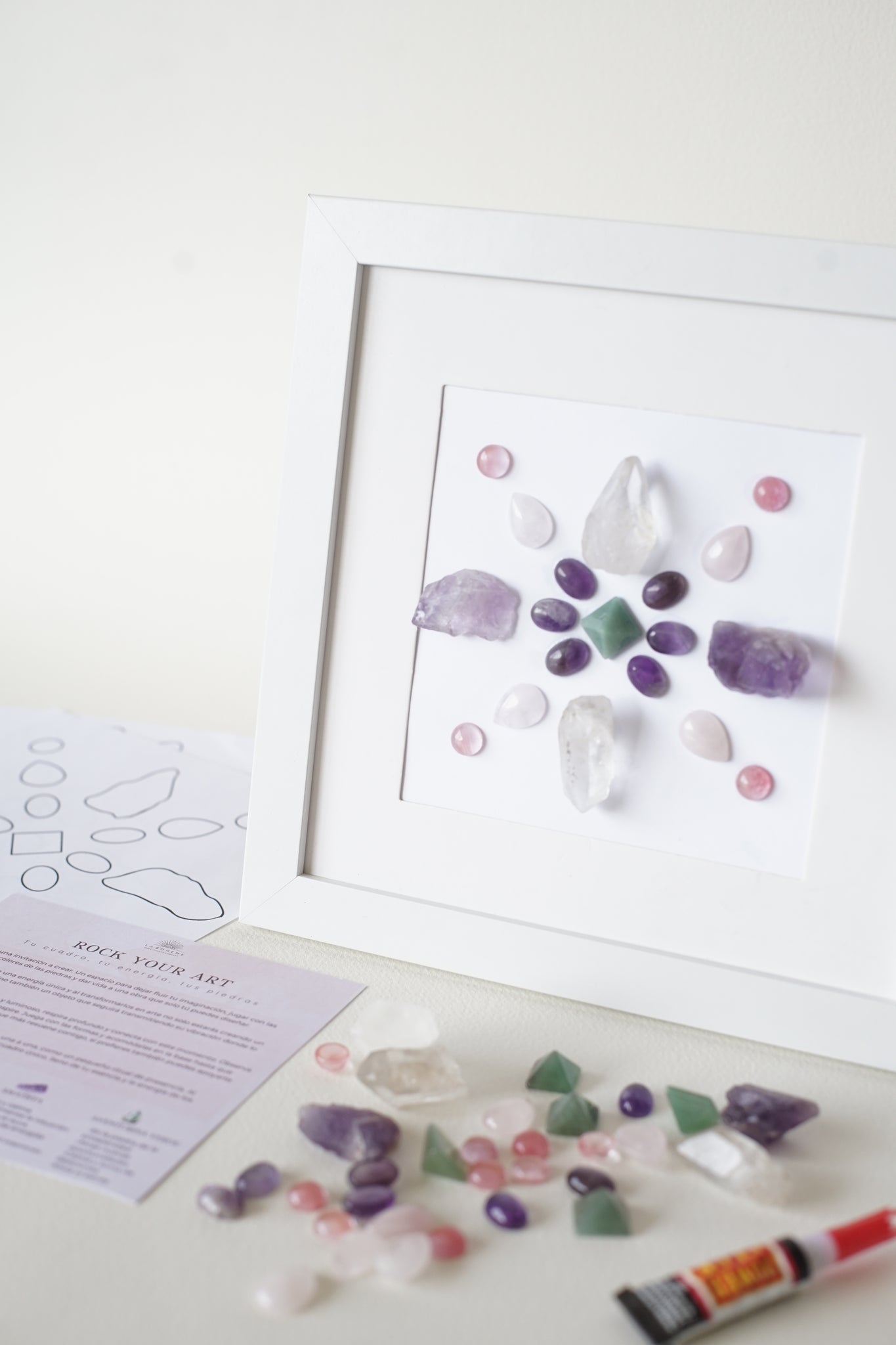 Un kit creativo con todo lo que necesitas para diseñar tu propio cuadro con piedras reales y sus propiedades.